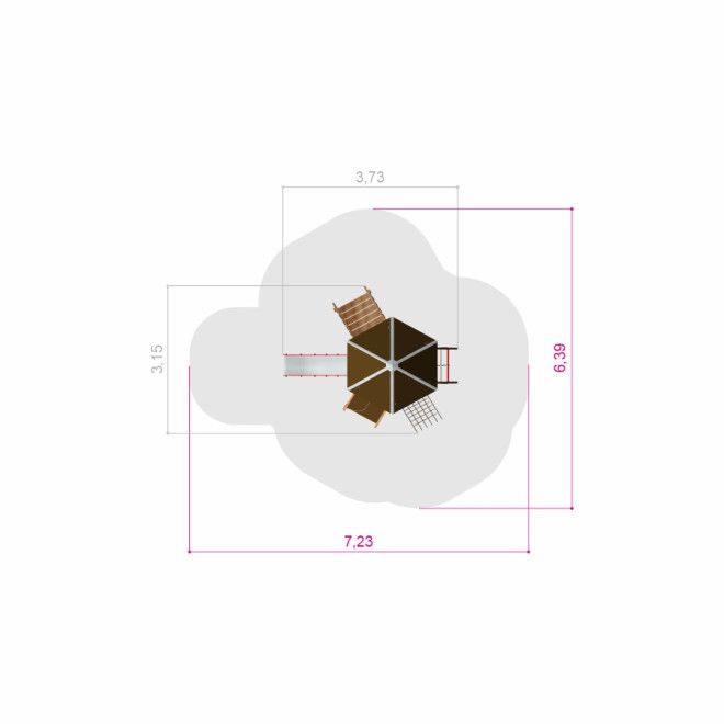 Sechseckiges Holzspielhaus mit Treppe und Rutsche H90 - Draufsicht