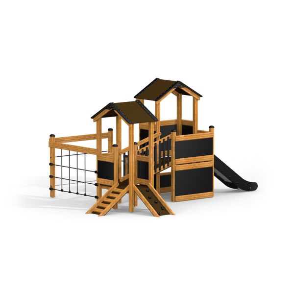 Bastei Spielhaus mit Kletternetz und Rutsche - Isometrische Ansicht