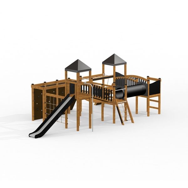 Spieltürme mit Tunnel, Kletterwand und Rutsche - Isometrische Ansicht