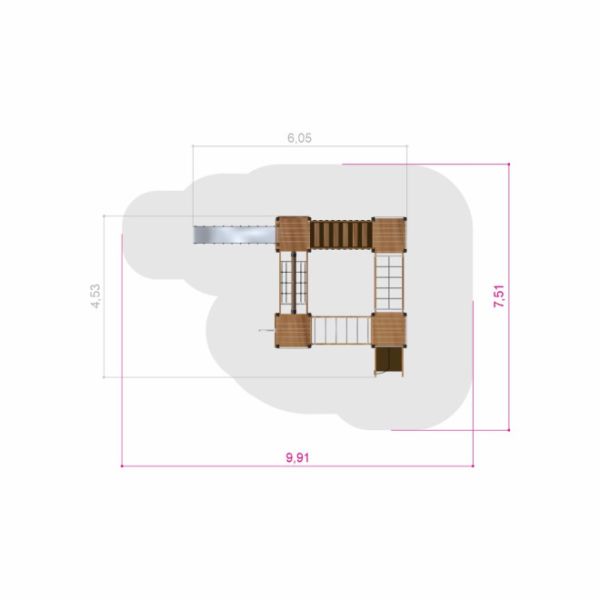 Mit ere Plattformhöhe vo bis zu 150 cm und ere kritische Fallhöhe vo 205 cm isch die Anlage optimal uf die Bedürfnisse vo Chind ab 3 Jahr uusgrichtet. D’Sicherheitszone und der erforderliche Fallschutz gewährleiste, dass d’Spielumgebig sicher und geschützt isch, was Eltern und Betreuer zuverlässeg macht.