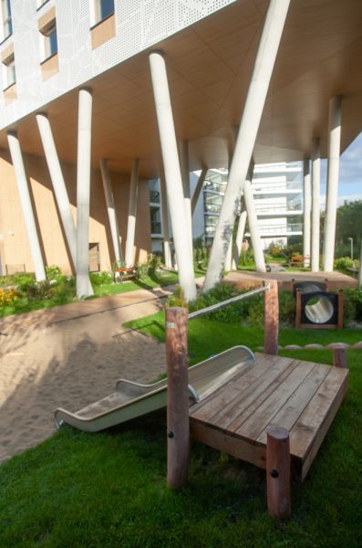Der Spielplatz wurde mit modernen, umweltfreundlichen Geräten aus einer Linie entworfen und ausgestattet, die mit dem renommierten Nordic Swan Ecolabel zertifiziert ist. Dieses skandinavische Zertifikat, eines der bekann...