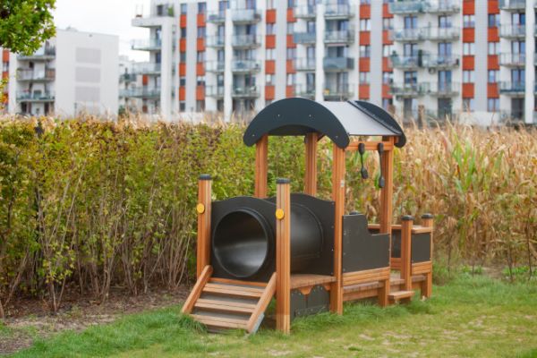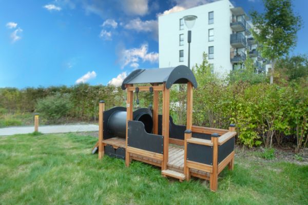 Der Spielplatz wurde mit modernen, umweltfreundlichen Geräten aus einer Linie entworfen und ausgestattet, die mit dem renommierten Nordic Swan Ecolabel zertifiziert ist. Dieses skandinavische Zertifikat, eines der bekann...