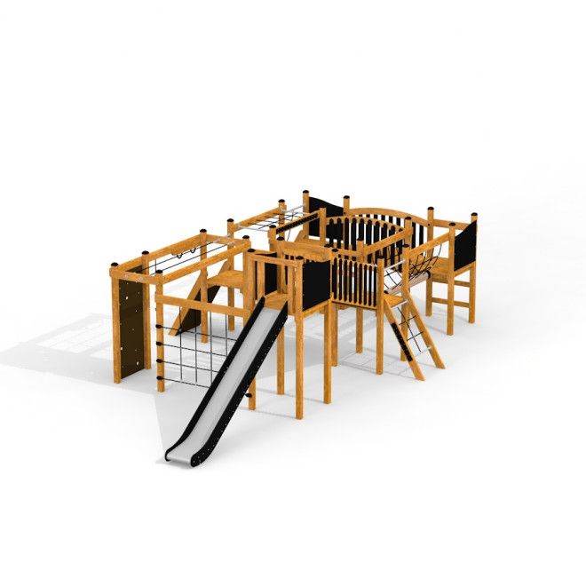 Die Piraten Basis II Spielanlage mit Rutsche isch perfekt für öffentliche Spielplätz, Schuele und Freizeitareal. Sie fördert Bewegig, Koordination und soziale Interaktion, während sie mit ihrem naturverbundene Design e angenehmi Atmosphäre schafft.
