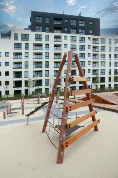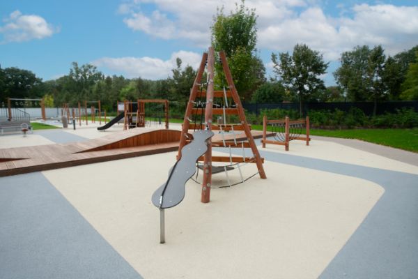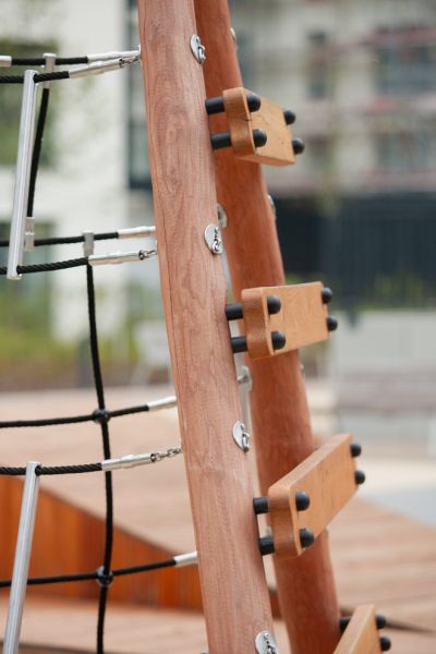 "Tipi I" dient insbesondere zur Entwicklung der motorischen Leistungsfähigkeit und der Koordination von Kindern. Das Outdoor-Klettergerüst beinhaltet eine Leiter mit hohem Neigungswinkel, ein Kletternetz und einen schrägen Kletteraufstieg mit Seil. Da die Gesamthöhe der Konstruktion 310 cm beträgt, ist der Fallschutz erforderlich.